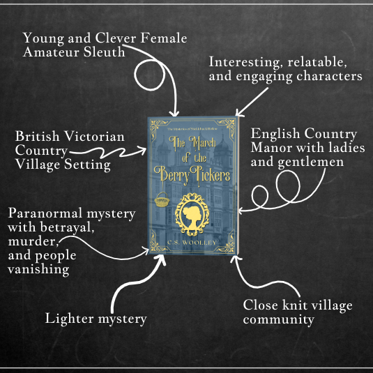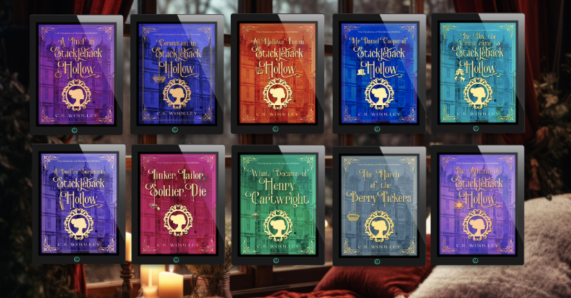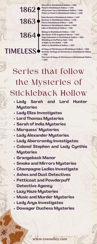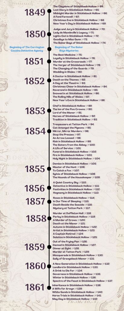 One of the things that I get asked the most for is a breakdown of the series for readers to be able to follow and check things off, especially after all the trouble there has been with amazon, saboteurs, and health problems. So I have created this timeline that features not only all of the books in the series both published and yet to come (yes, they have been plotted and waiting their turn to be released into the wild), but the spin-off series that I have planned for this pen name as well. Some of them will feature a subset of the characters you’ve come to know and love in the Mysteries of Stickleback Hollow. The others are all descendants of the characters from this first series. I hope you enjoy them all and this helps you to keep track of the series and where you are up to in your reading!