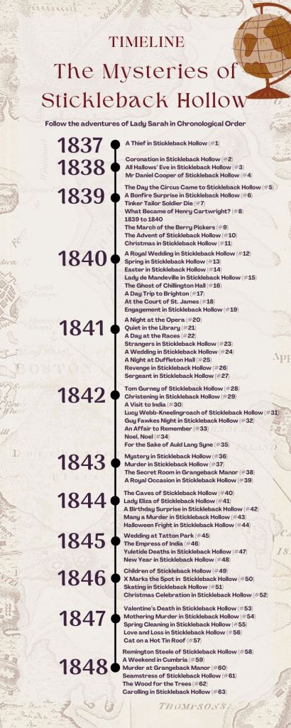 So that you know what has been released so far, the trope explosions below are a record of the released titles. The titles that are coming soon are featured but with cover mood icons instead. The series is set in the fictional village of Stickleback Hollow in the English County of Cheshire and the books begin just as Queen Victoria assumes the throne.